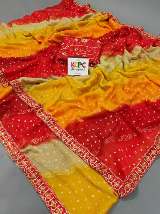 Latest New Pure Khaddi Georgette Neemzari Bandhej Gotapatti work saree with blouse, KCPC, AMT