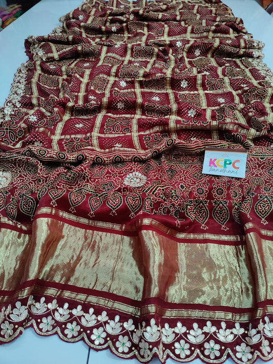 Pure Modal Gaji Silk Bandhani Ajrakh Handblock Saree with Gotapatti Handwork