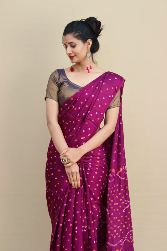 Pure Gaji Silk Wine Bandhani Saree with blouse