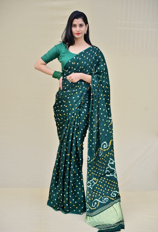 Pure Gaji Silk Bottle Green Bandhani Saree with blouse
