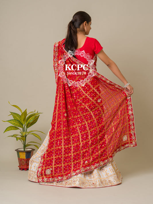 Pure Khaddi Georgette Upada Janglaw Bandhani Neemzari Bridal Red Chunri Dupatta, KCPC, NR