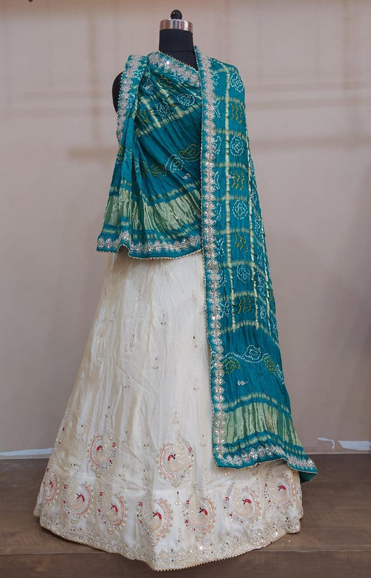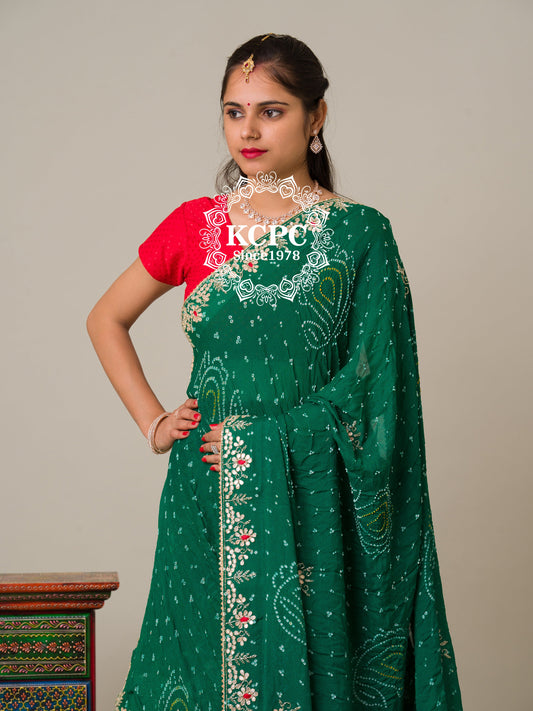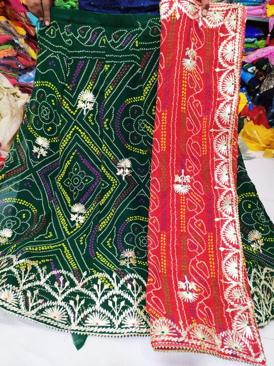 Pure Gorgette bahndej Kachchi Patti Work duppta lehenga,rtk,NR