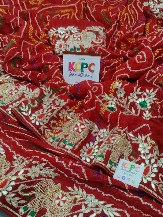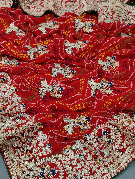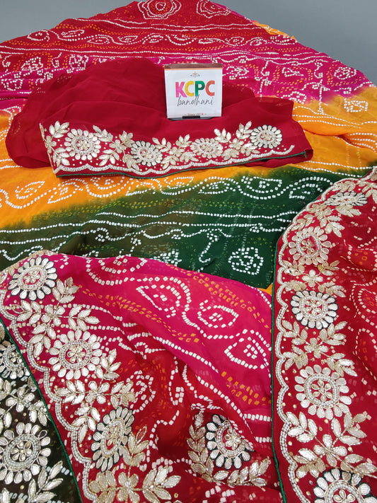 Pure Georgette Raidana Bandhej Gotapatti Pachrangi Chunri Jaipuri Saree SL