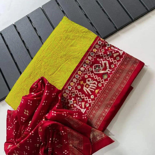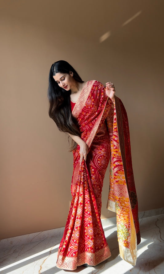 Pure georgette bandhani with zari weaving border saree